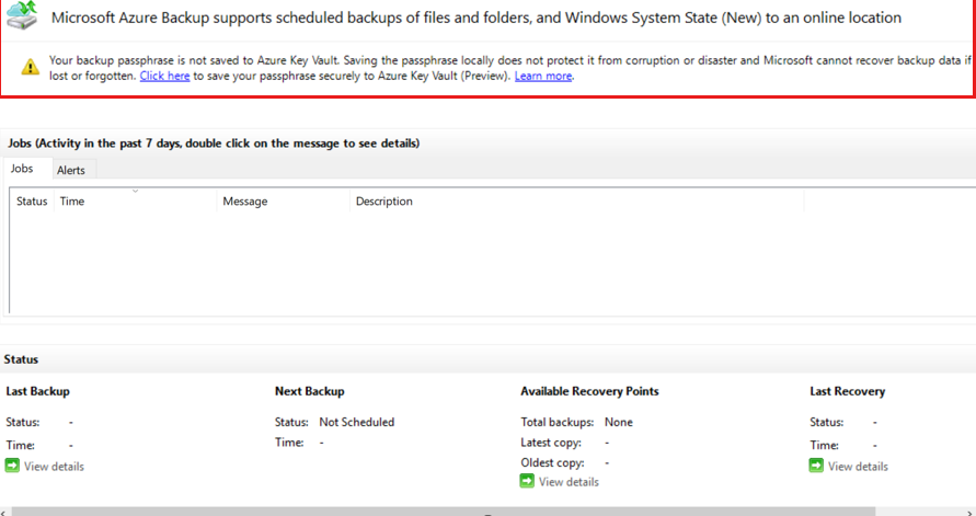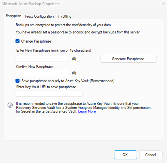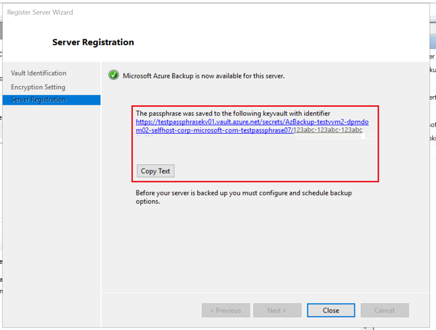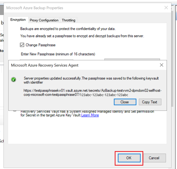 If this passphrase is lost, Microsoft will not be able retrieve backup data stored in the Recovery Services vault. We recommend that you store this passphrase in a secure external location, such as Azure Key Vault.