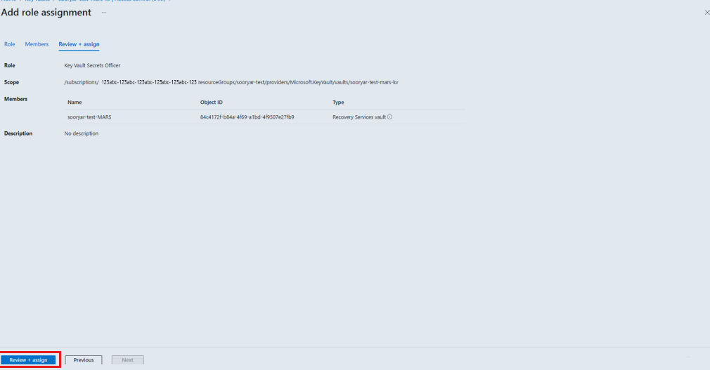 - To save the passphrase as a Secret in Azure Key Vault, assign permissions to the Recovery Services vault.