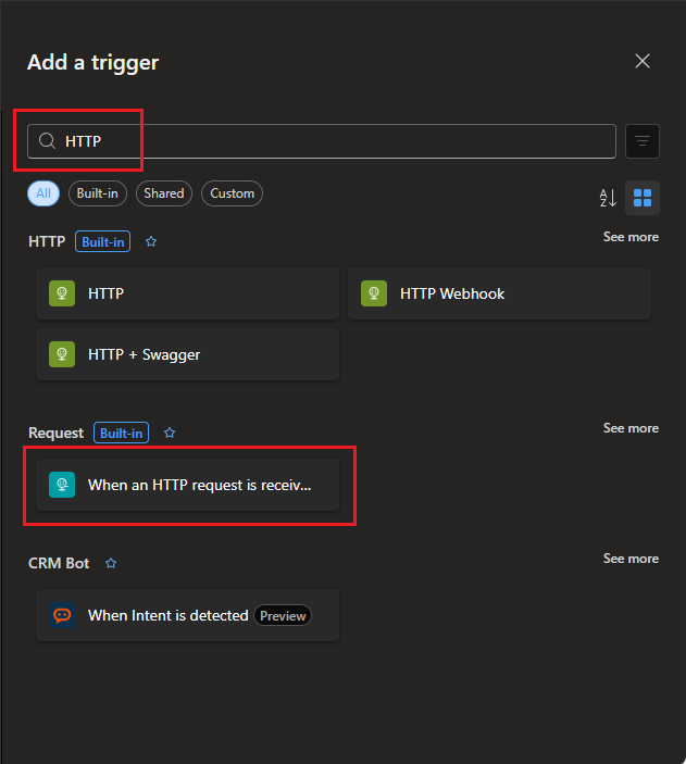 Scroll through the results and select Request - When an HTTP request is received as the trigger.