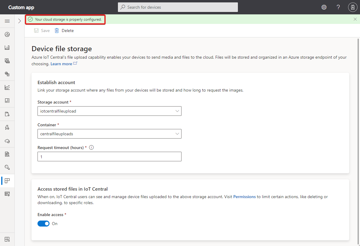 To let users view and manage uploaded files in IoT Central, set Enable access to On.