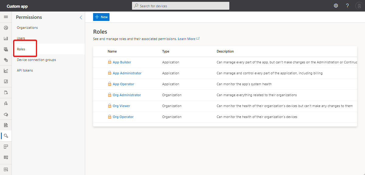 Users in the App Operator role can monitor device health and status. They aren't allowed to make changes to device templates or to administer the application. Operators can add and delete devices, manage device sets, and run analytics and jobs.