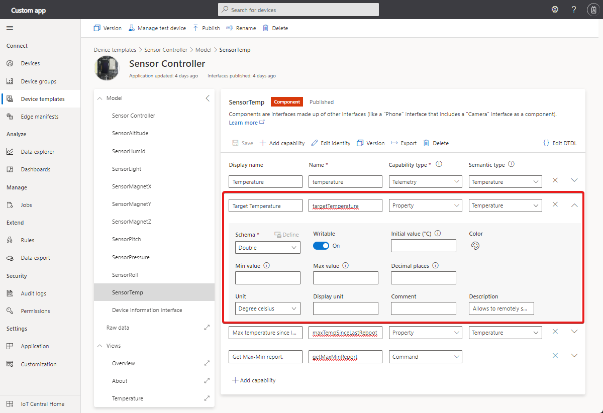 The following screenshot shows a property definition in an Azure IoT Central application.