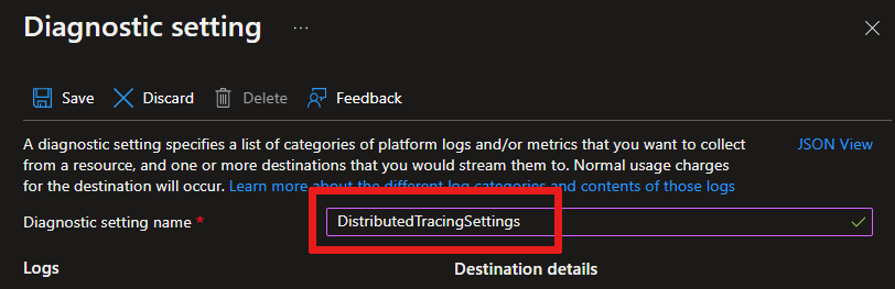 In the Diagnostic setting name box, enter a name for a new diagnostic setting. For example, enter DistributedTracingSettings.