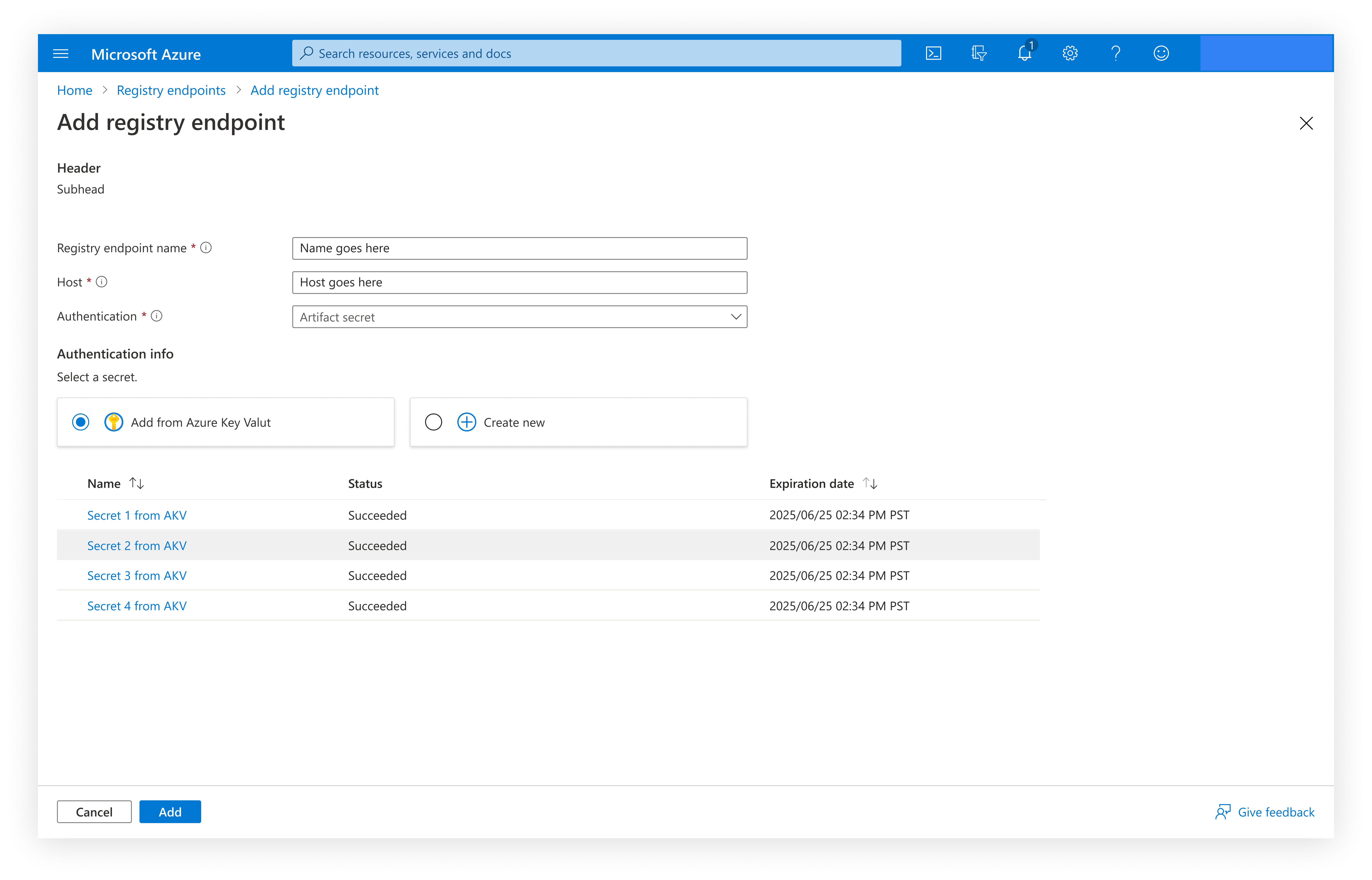 You can use the Azure portal to create registry endpoints. The portal experience allows you to specify and provide host details of an ACR, and optionally provide credentials. Before you begin, ensure that you have the following information:
