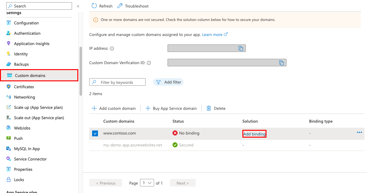Den här artikeln visar hur du ger säkerhet för anpassad domän i din Azure App Service-app eller funktionsapp genom att skapa en certifikatbindning. När du är klar kan du komma åt din App Service-app vid https:// slutpunkten för ditt anpassade DNS-namn (Domain Name System). Ett exempel är https://www.contoso.com.