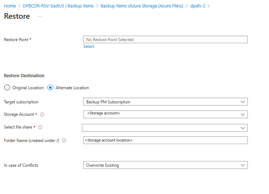 Säkerhetskopiering med valv stöder för närvarande endast fullständig resursåterställning till en alternativ plats. Målfilresursen som valts för återställning måste vara tom.