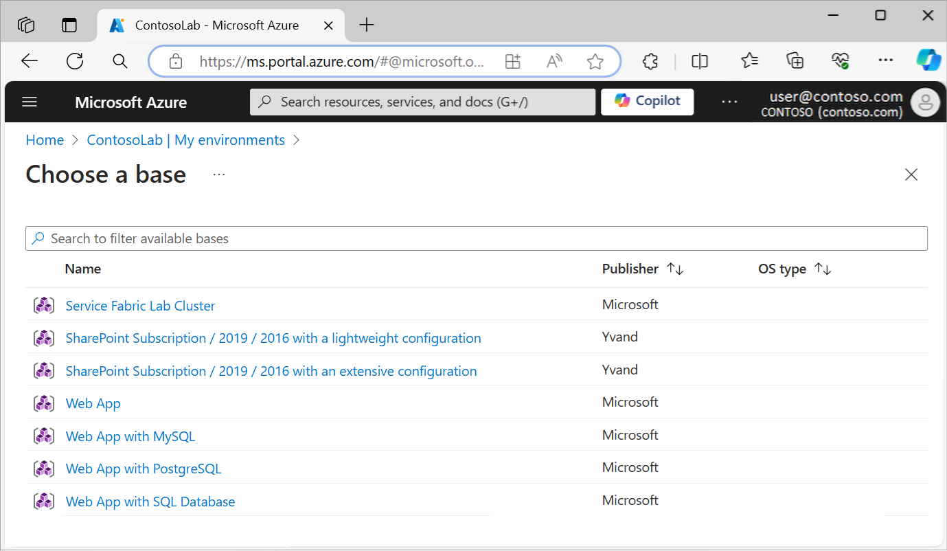 På sidan Välj en bas väljer du den miljö som ska skapas.