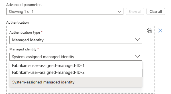 Om ditt scenario kräver finare kontroll över autentisering av API-anslutningar ändrar du autentiseringen för anslutning nr 1 från den systemtilldelade standardidentiteten till alla användartilldelade identiteter som du lägger till i logikappen. Den här autentiseringen gäller för varje API-anslutning, så att du kan blanda systemtilldelade och användartilldelade identiteter mellan olika anslutningar till samma målresurs.