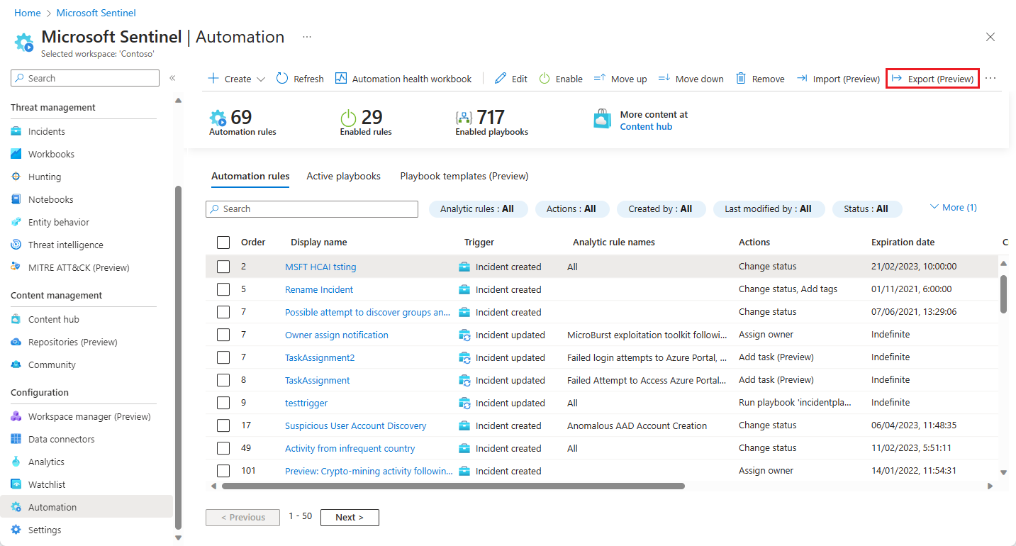 Hantera dina Microsoft Sentinel-automatiseringsregler som kod! Nu kan du exportera dina automatiseringsregler till ARM-mallfiler (Azure Resource Manager) och importera regler från dessa filer som en del av ditt program för att hantera och kontrollera dina Microsoft Sentinel-distributioner som kod. Exportåtgärden skapar en JSON-fil på webbläsarens nedladdningsplats, som du sedan kan byta namn på, flytta och på annat sätt hantera som alla andra filer.