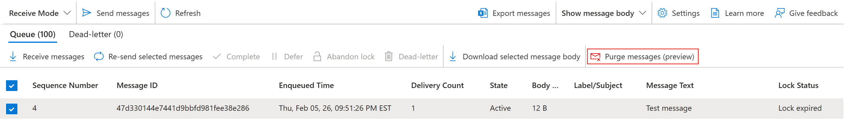 Med hjälp av funktionen peek kan du använda Service Bus Explorer för att visa de 100 viktigaste meddelandena i en kö, prenumeration eller kö med obeställbara meddelanden.