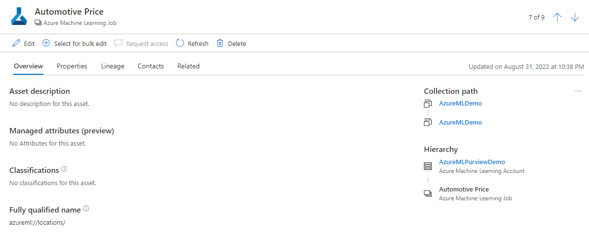 From the list, you can select on any of the asset items to view details. For example, selecting one of the Azure Machine Learning job assets displays the details of the job.