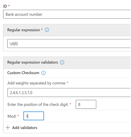 - Weights: To define the series of numbers with which each digit starting from position 1 to last position of the regex needs to be multiplied. This calculates the sum product. Weight positions refer to the order of the digits only, it doesn't consider any nondigit characters like dashes.
