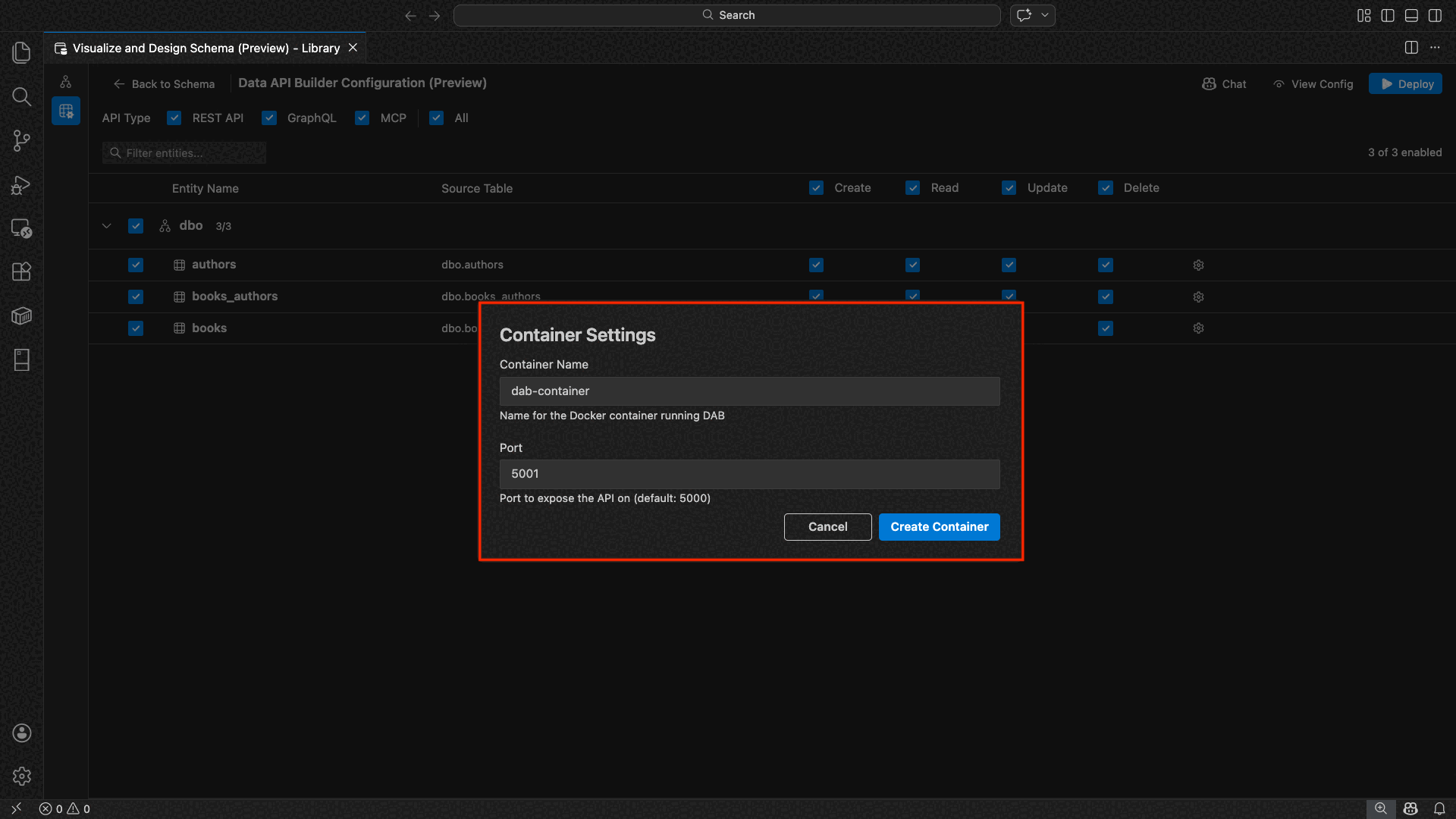 MSSQL-tillägget för Visual Studio Code innehåller ett integrerat användargränssnitt för Data API Builder, så att du kan skapa REST-, GraphQL- och MCP-slutpunkter för dina SQL-databastabeller utan att skriva konfigurationsfiler eller lämna Visual Studio Code. Du kan välja vilka tabeller som ska exponeras, konfigurera CRUD-behörigheter, välja API-typer, förhandsgranska den genererade konfigurationen och distribuera en lokal serverdel som drivs av Data API Builder, allt från ett visuellt gränssnitt.
