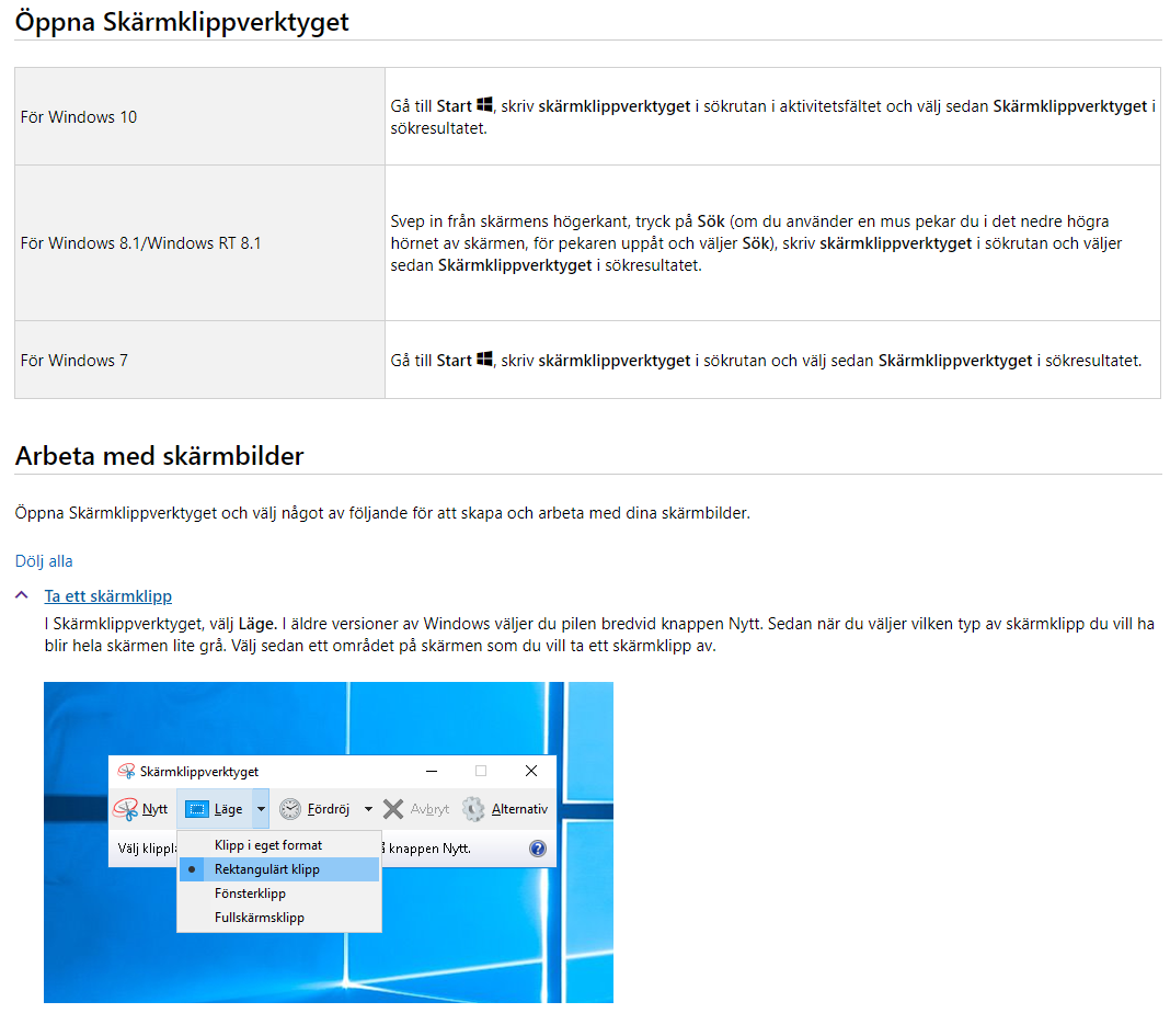 För att ta Skärmbilder i Windows kan du använda Skärmklippverktyget som du kan läsa om i bilden nedan, mer informaiton finns om du klickar på bilden: