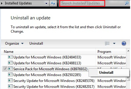 Du kan söka efter en viss uppdatering i sökrutan, skriv tillexempel KB976932 (som i bilden) i sökrutan :