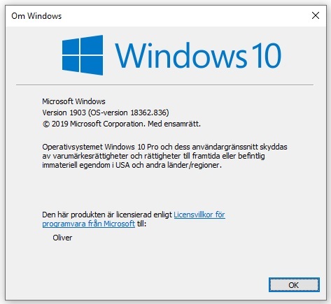 Därefter så vill jag att du tar en bild på din Windows-version och skickar till mig. Du hittar den genom att hålla Windows-tangenten intryckt och trycka på R, i sökrutan som dyker upp skriver du winver och sedan trycker du på ok. Den ruta som dyker upp vill jag att du tar en bild på.