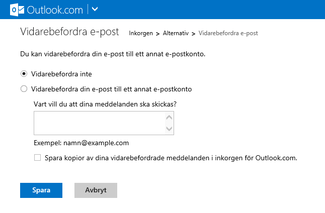 - Välj alternativet och ange till vilken e-postadress som nya meddelanden ska vidarebefordras till.