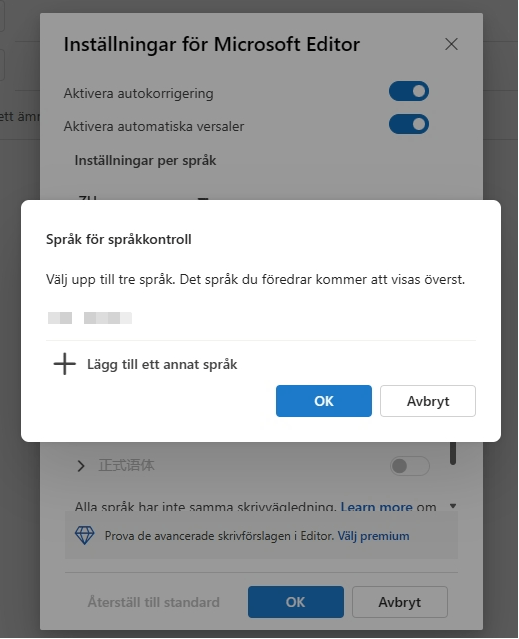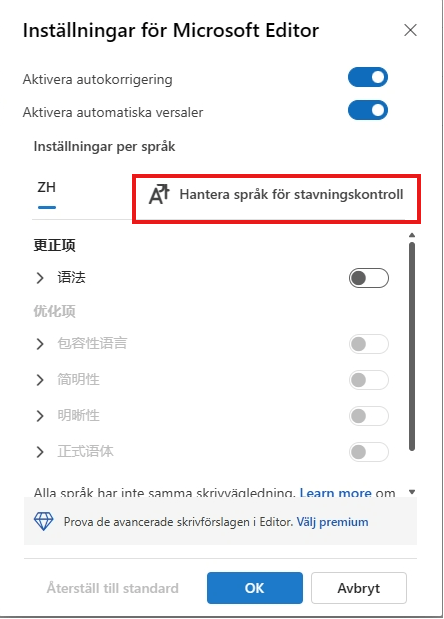 I Inställningar för Microsoft Editor klickar du på Hantera språk för stavningskontroll för att lägga till upp till tre språk för språkkontroll.