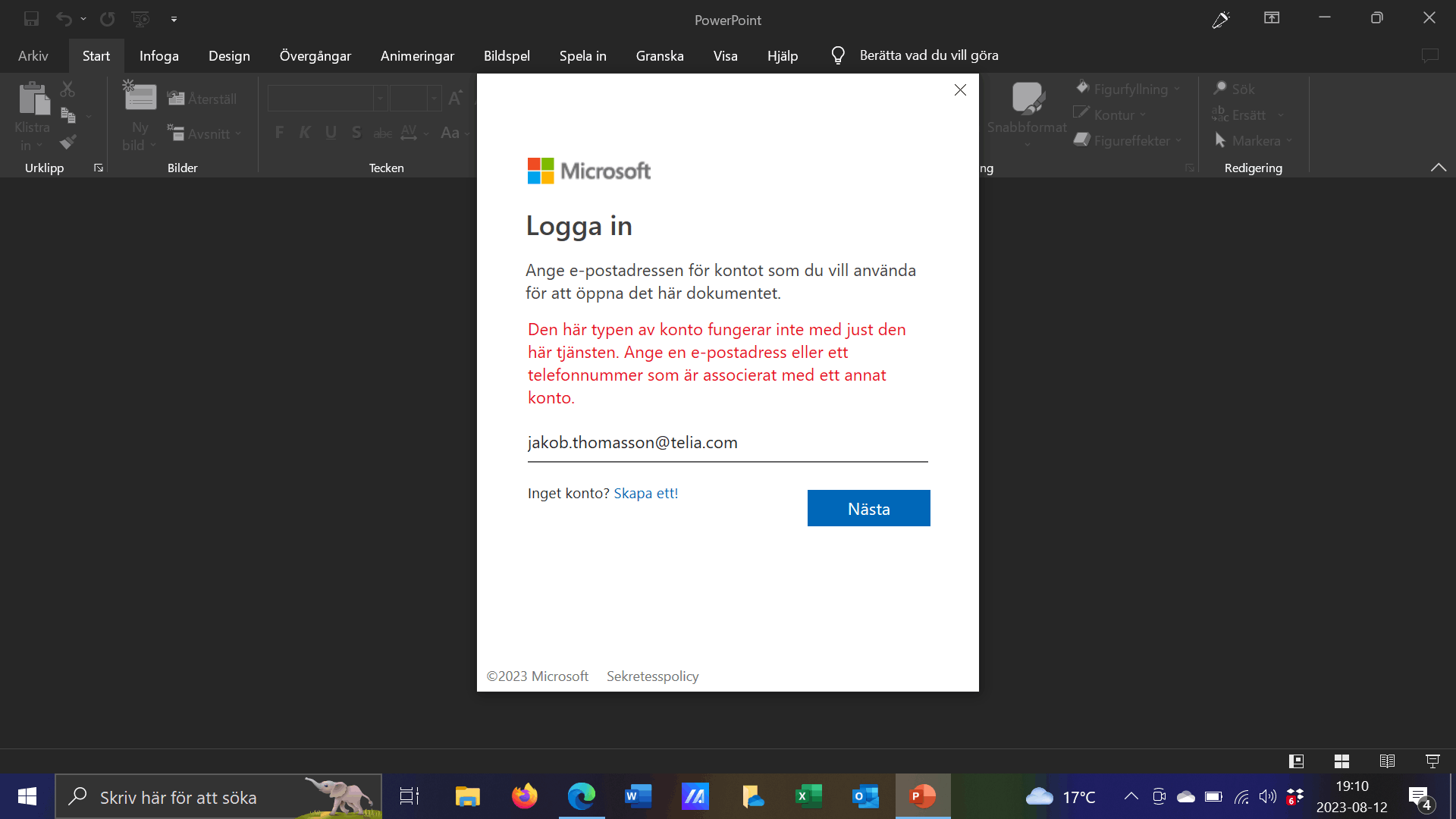 Meddela mig om det här är ditt personliga Microsoft-konto eller ditt Arbete\Skola-konto?