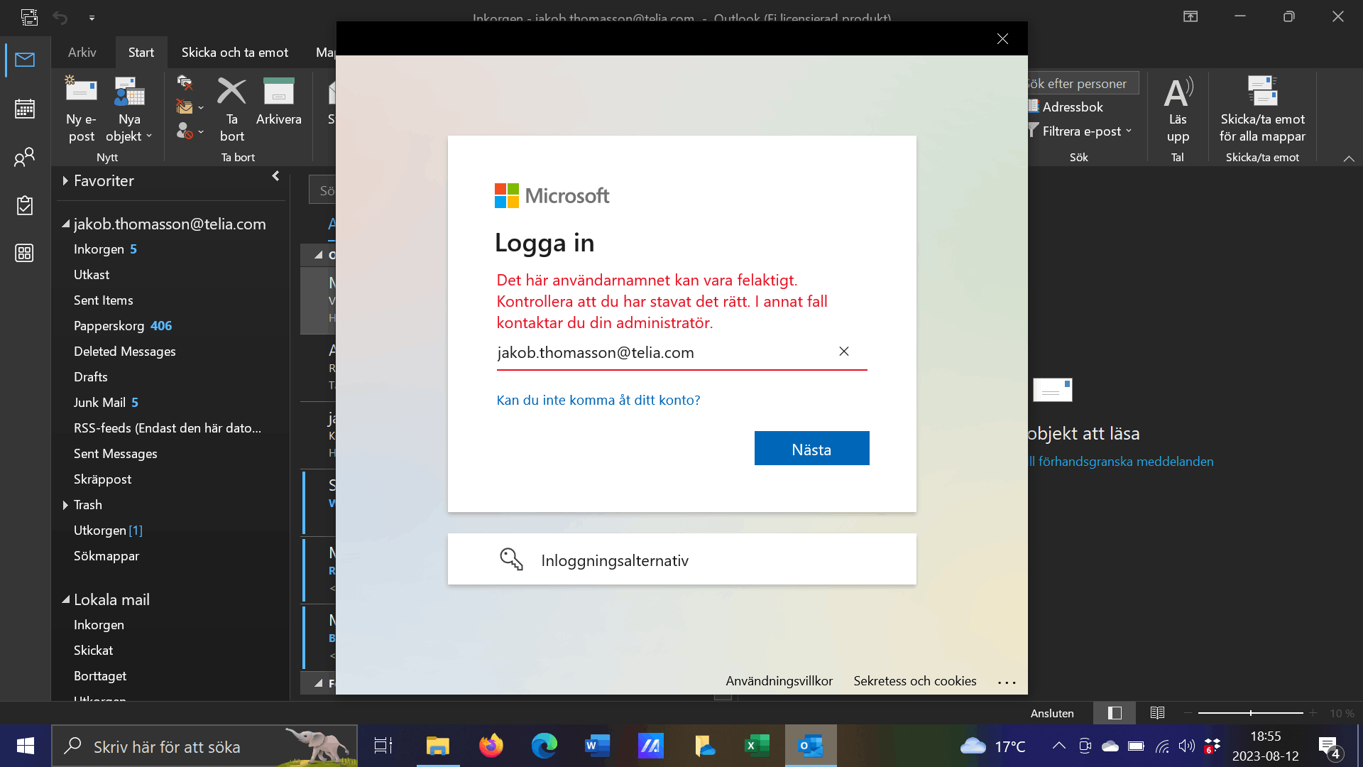 Från vilken applikation och hur du försöker komma åt ditt konto ? Om möjligt, bifoga skärmdump av problemet för att hjälpa dig vidare.