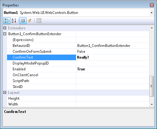 - Select the Button control in the Designer and expand the Extenders, Button1_ConfirmButtonExtender node in the Properties window (see Figure 6). Assign the value 'Really?' to the ConfirmText property.