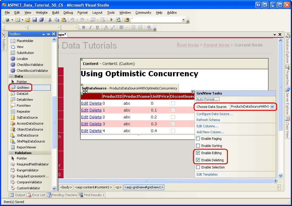 <asp:SqlDataSource ID="ProductsDataSourceWithOptimisticConcurrency"