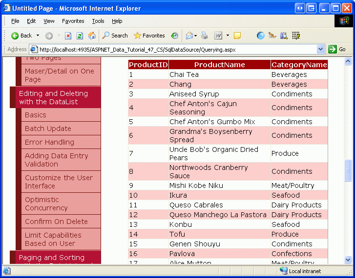 Default.aspxQuerying.aspxParameterizedQueries.aspxInsertUpdateDelete.aspxOptimisticConcurrency.aspx