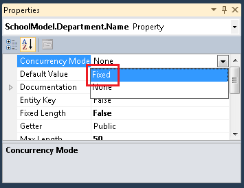 Open SchoolModel.edmx, and in the data model designer, right-click the Name property in the Department entity and then click Properties. In the Properties window, change the ConcurrencyMode property to Fixed.