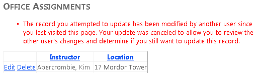 In the previous tutorial you learned how to sort and filter data using the ObjectDataSource control and the Entity Framework. This tutorial shows options for handling concurrency in an ASP.NET web application that uses the Entity Framework. You will create a new web page that's dedicated to updating instructor office assignments. You'll handle concurrency issues in that page and in the Departments page that you created earlier.