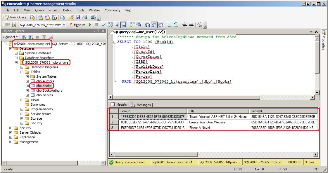 If you download the Book Reviews application please keep in mind that its purpose is to demonstrate deploying a data-driven application. It does not exhibit best practices as far as application design. For example, there is no separate Data Access Layer (DAL); the ASP.NET pages communicate directly with the database through the SqlDataSource control or ADO.NET code in their code-behind classes. For a more in-depth look at creating data-driven applications using a tiered architecture, refer to my Working with Data tutorials.
