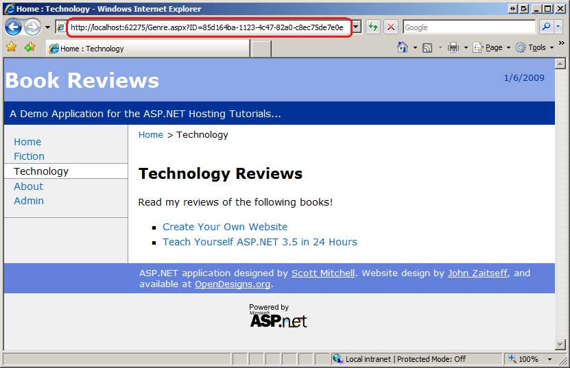 The previous version of the Book Reviews website had a separate ASP.NET page for each book. For example, there was a page named ~/Tech/TYASP35.aspx that contained the review for Teach Yourself ASP.NET 3.5 in 24 Hours. This new data-driven version of the website has the reviews stored in the database and a single ASP.NET page, Review.aspx?ID=bookId, which displays the review for the specified book. Likewise, there is a Genre.aspx?ID=genreId page that lists the reviewed books in the specified genre.