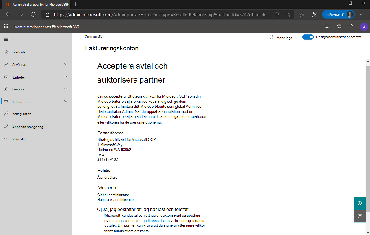 Kunden med Administrationscenter för Microsoft 365 globala administratörsbehörigheter väljer länken i e-postmeddelandet. Länken tar dem till följande Administrationscenter för Microsoft 365 sida:
