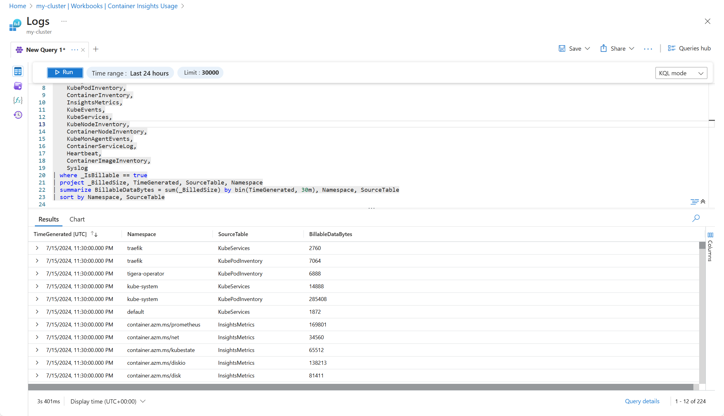 Följande skärmbild visar till exempel en ändring av loggfrågan som används för Efter tabell som visar data efter namnområde och tabell.