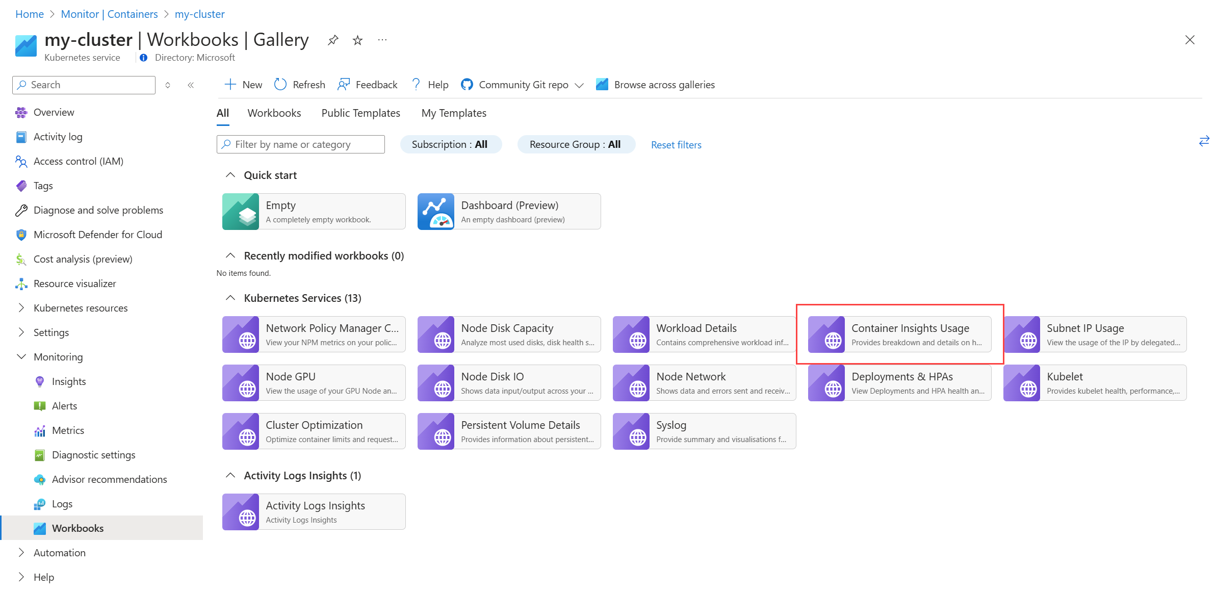 Du kan visualisera hur mycket data som matas in i varje arbetsyta med hjälp av runboken Container Insights Usage, som är tillgänglig från sidan Arbetsböcker i ett övervakat kluster.