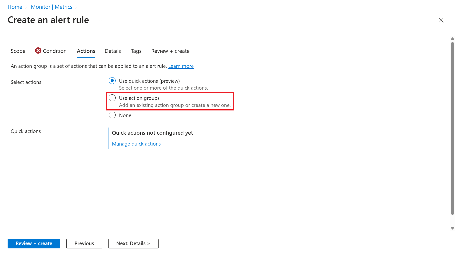 Välj Använd åtgärdsgrupper för att lägga till en befintlig grupp i aviseringen eller skapa en ny.
