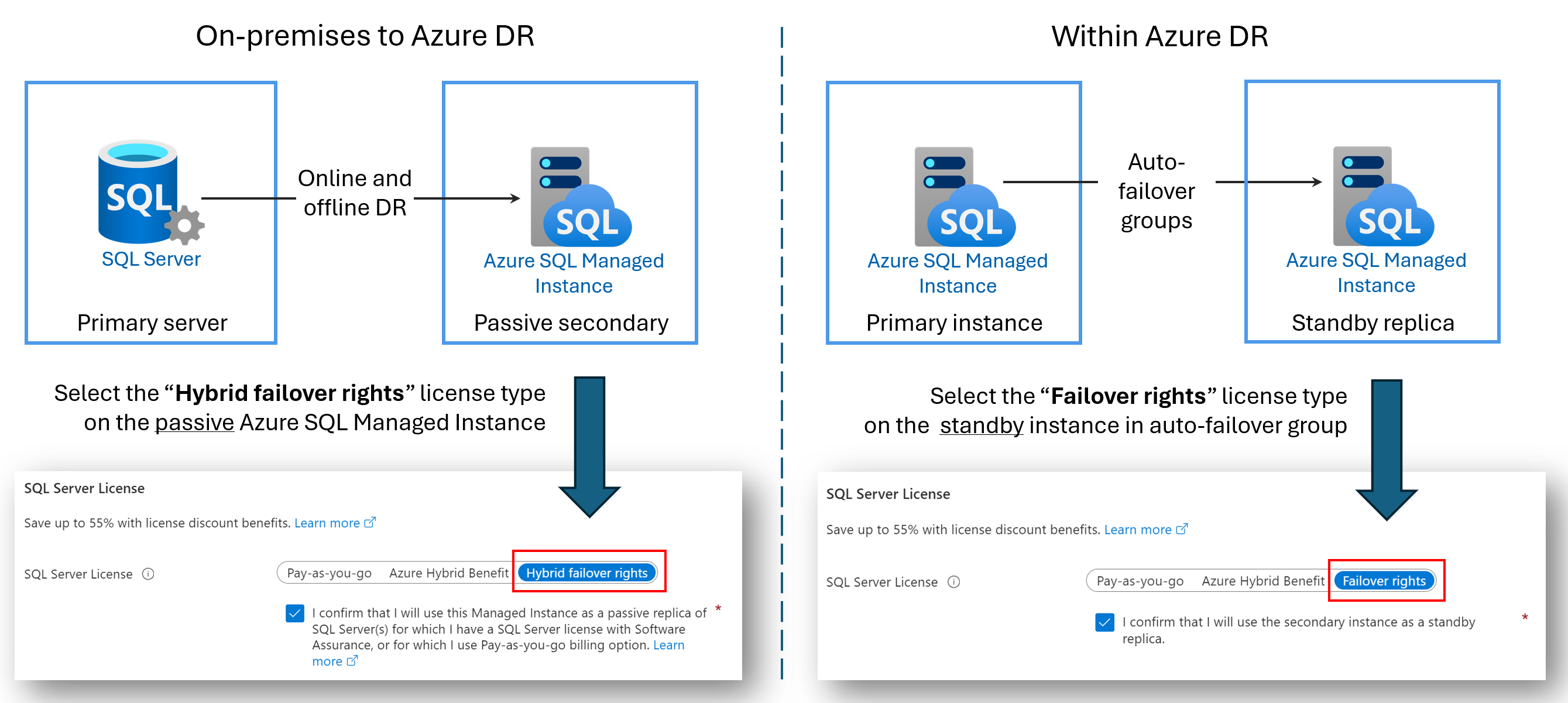 - Hybrid failover-rättigheter för en passiv replik: När du konfigurerar en länk mellan SQL Server och Azure SQL Managed Instance kan du använda Hybrid failover-rättigheterna för att spara på vCore-licenseringskostnader för den passiva sekundära repliken.