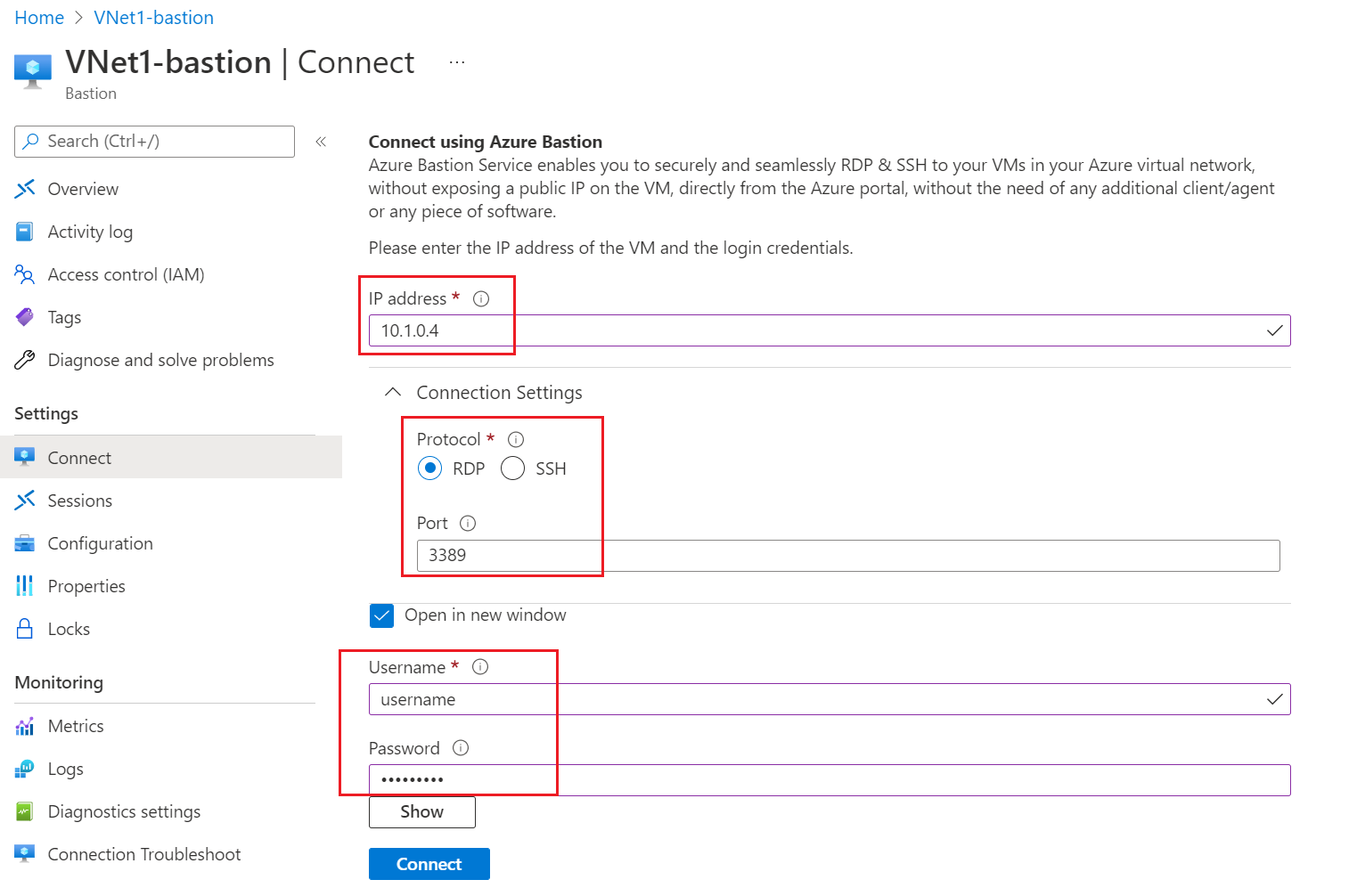 To connect to a VM using a specified private IP address, you make the connection from Bastion to the VM, not directly from the VM page. On your Bastion page, select Connect to open the Connect page.
