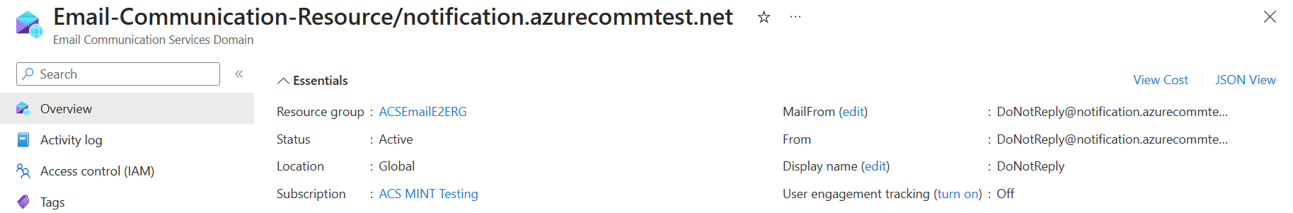 Öppna översiktssidan för resursen e-postkommunikationstjänst som du skapade i Snabbstart: Skapa och hantera en resurs för e-postkommunikationstjänsten.