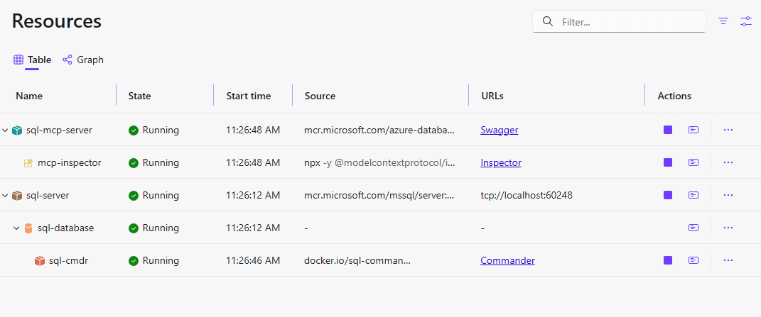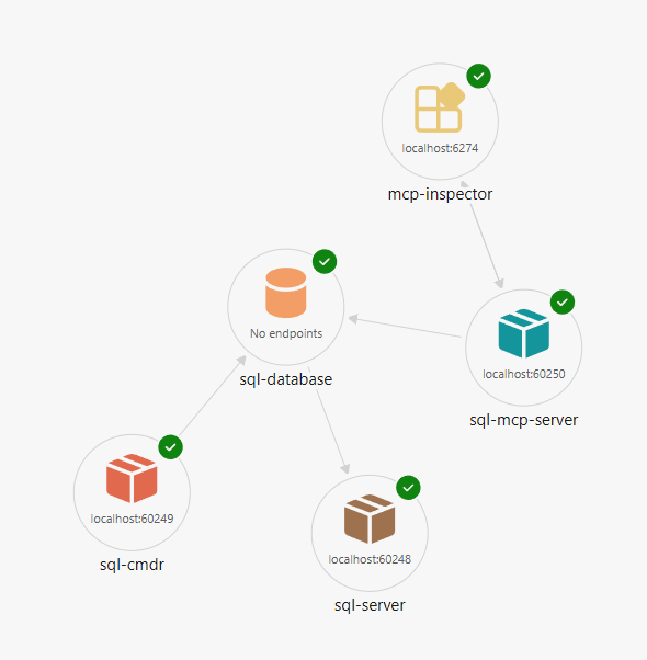 I det här steget kör du din Aspire-miljö och bekräftar att SQL Server, SQL MCP Server och MCP Inspector fungerar tillsammans.