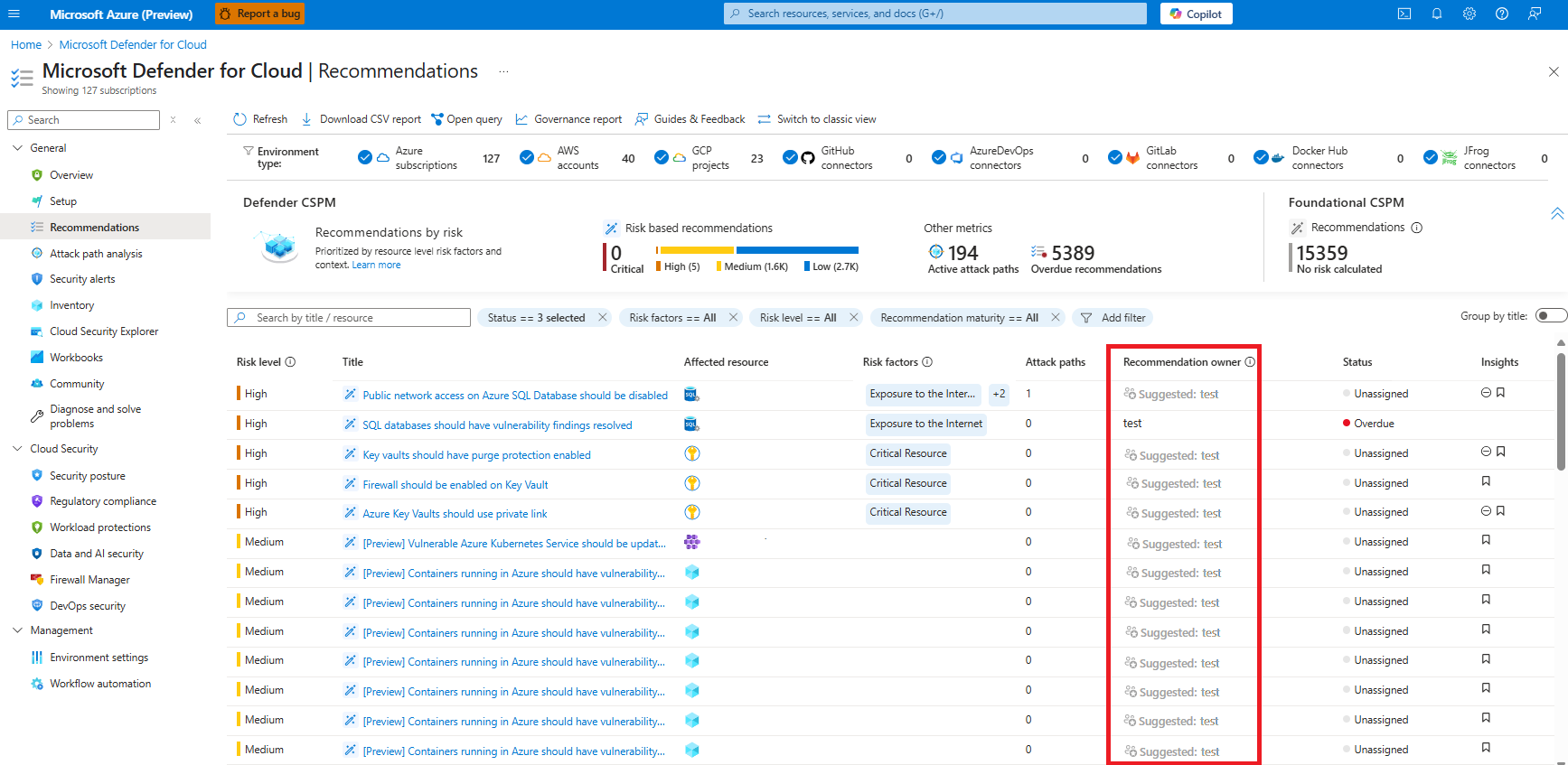 Gå till Defender för Cloud>Rekommendationer.
