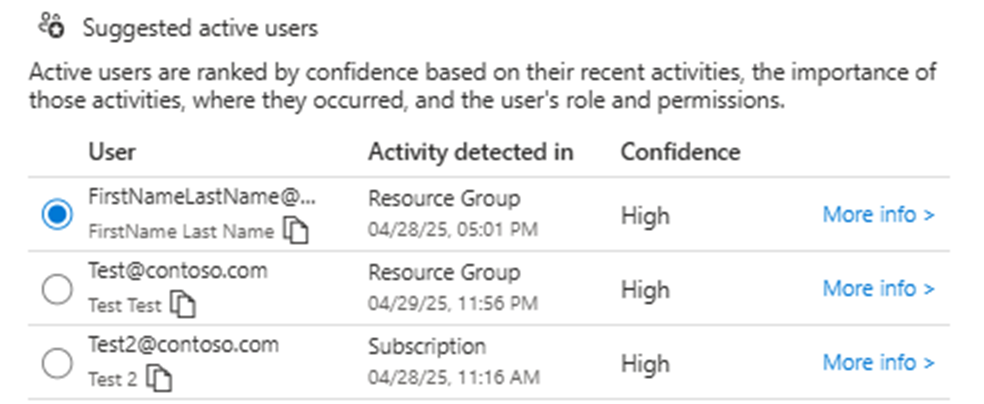 Granska aktivitetsinformationen och konfidensen för de tre främsta föreslagna användarna.