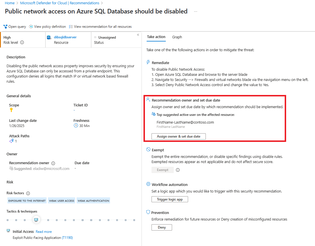 I avsnittet Rekommendationsägare och ange förfallodatum föreslår Defender för molnet den mest aktiva användaren på den berörda resursen.