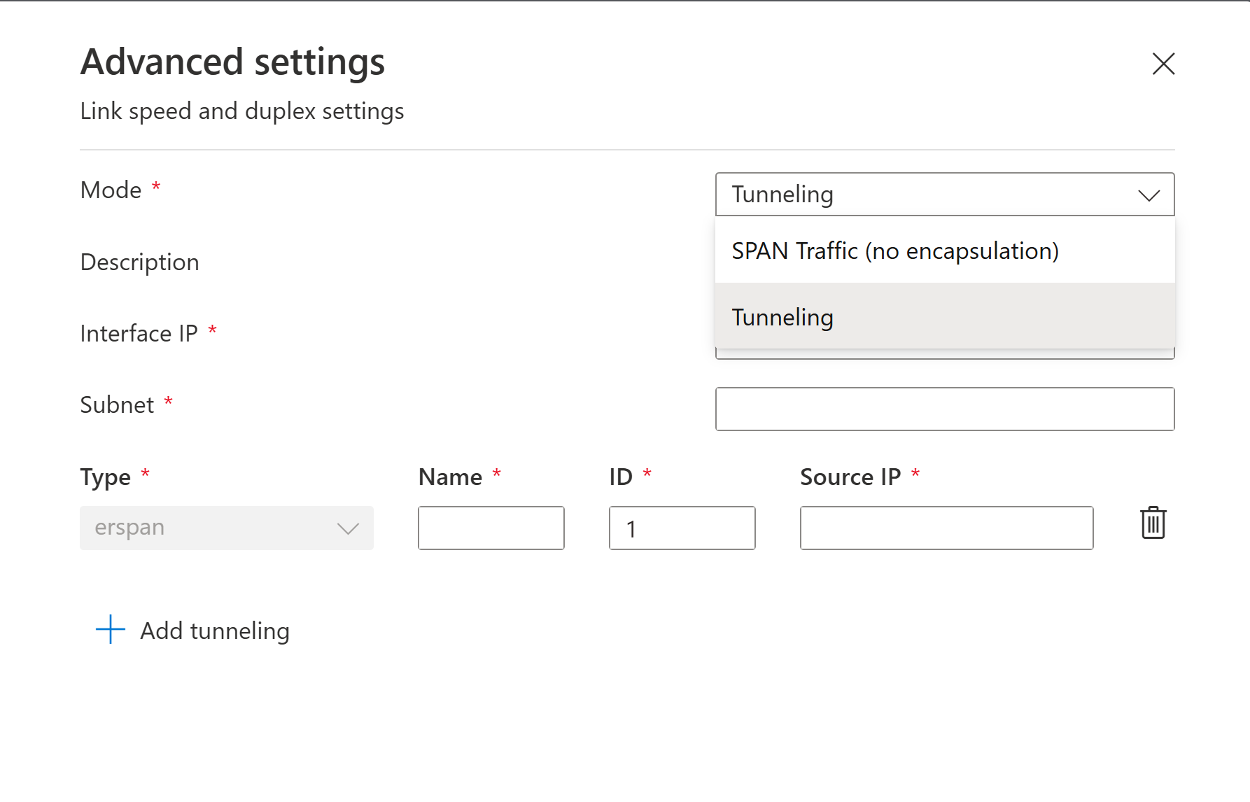 Om ett ID matchar fel tar sensorn bort all inkommande tunneltrafik.Käll-IP IP-adressen för ERSPAN-gränssnittet på Cisco-sidan som skickar tunneltrafiken. Lägga till tunneltrafik Sensorn stöder tillägg av flera tunnlar. Varje tunnel måste ha ett unikt namn och ID. Automatisk förhandling Endast relevant för fysiska datorer. Använd det här alternativet för att avgöra vilken typ av kommunikationsmetoder som används, eller om kommunikationsmetoderna definieras automatiskt mellan komponenterna.