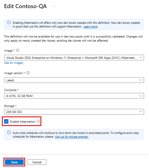 - Om du använder en anpassad Azure Compute Gallery-avbildning aktiverar du viloläge på din Azure Compute Gallery-avbildning innan du aktiverar viloläge i Dev Box-definitionen.