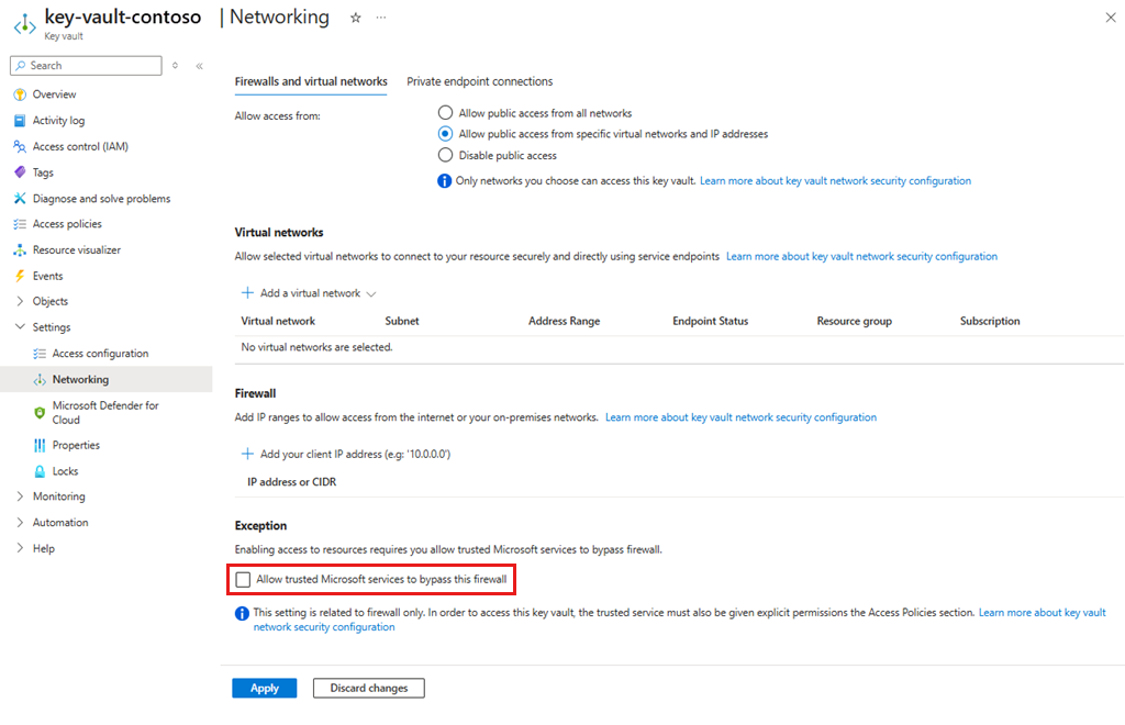 Mer information om hur du låter betrodda Microsoft-tjänster kringgå brandväggen finns i Konfigurera nätverksinställningar för Azure Key Vault.