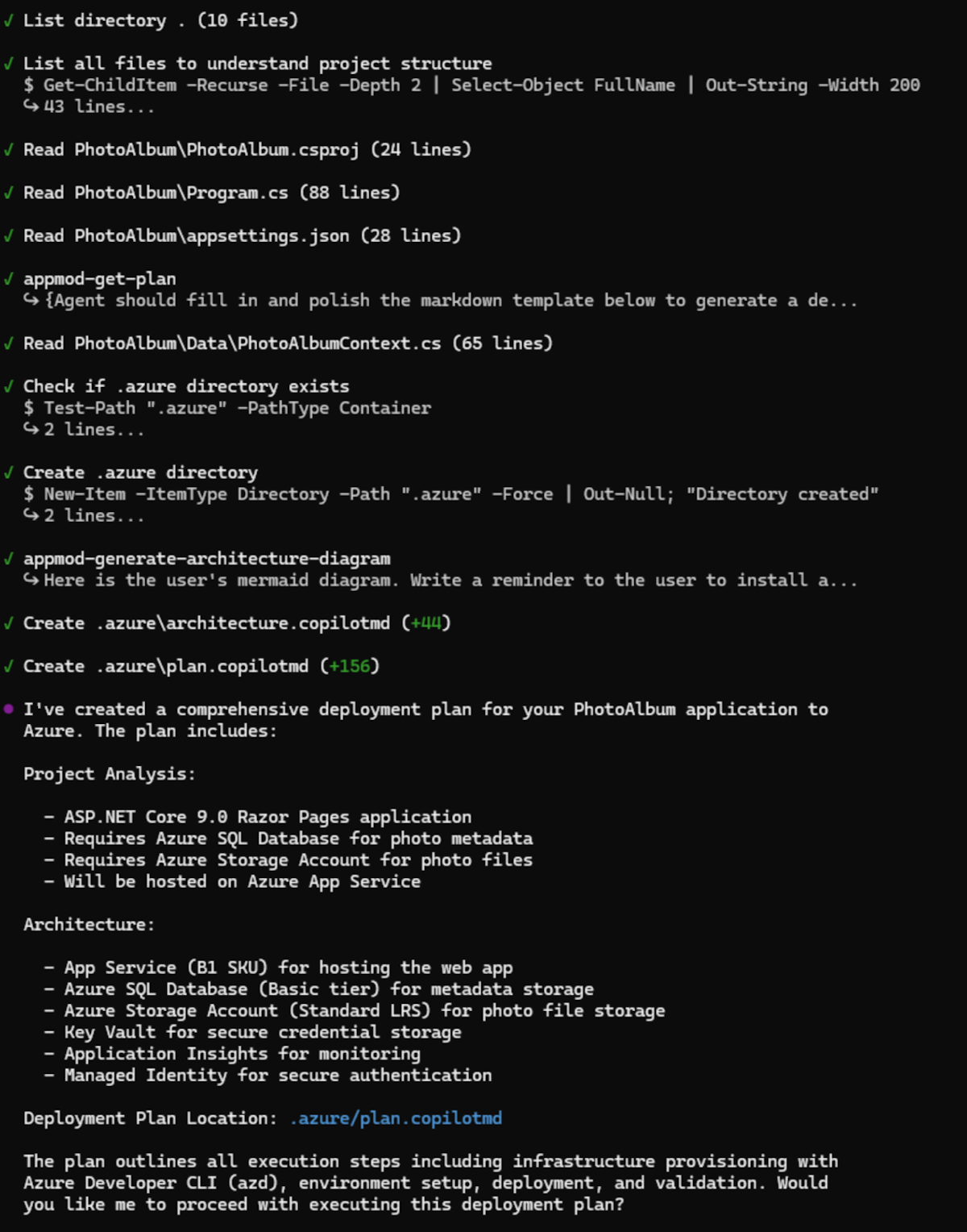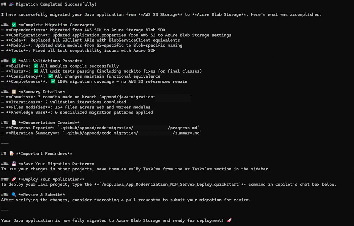Med den här prompten körs migreringsuppgiften och visar förloppet i Copilot CLI.