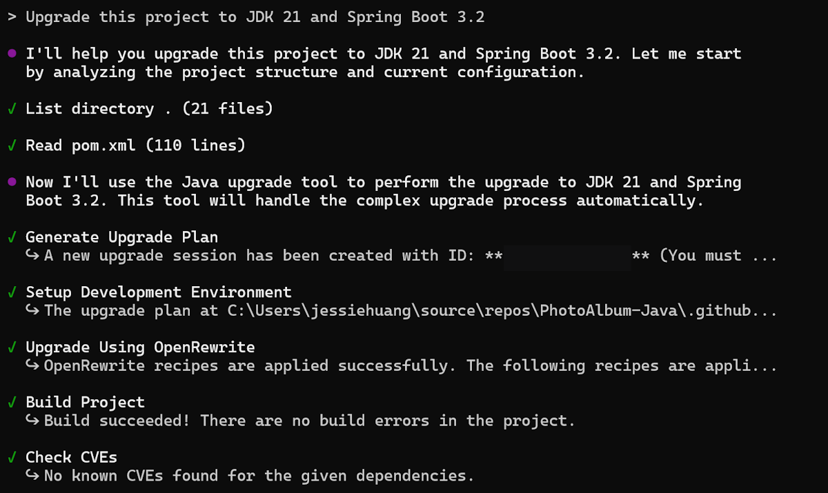 Om du vill uppgradera Java-programmet till en nyare körnings- eller ramverksversion kör du följande exempelprompt i Copilot CLI. Den här metoden hjälper dig att se till att projektet håller sig i linje med de senaste plattformsfunktionerna och säkerhetsuppdateringarna.