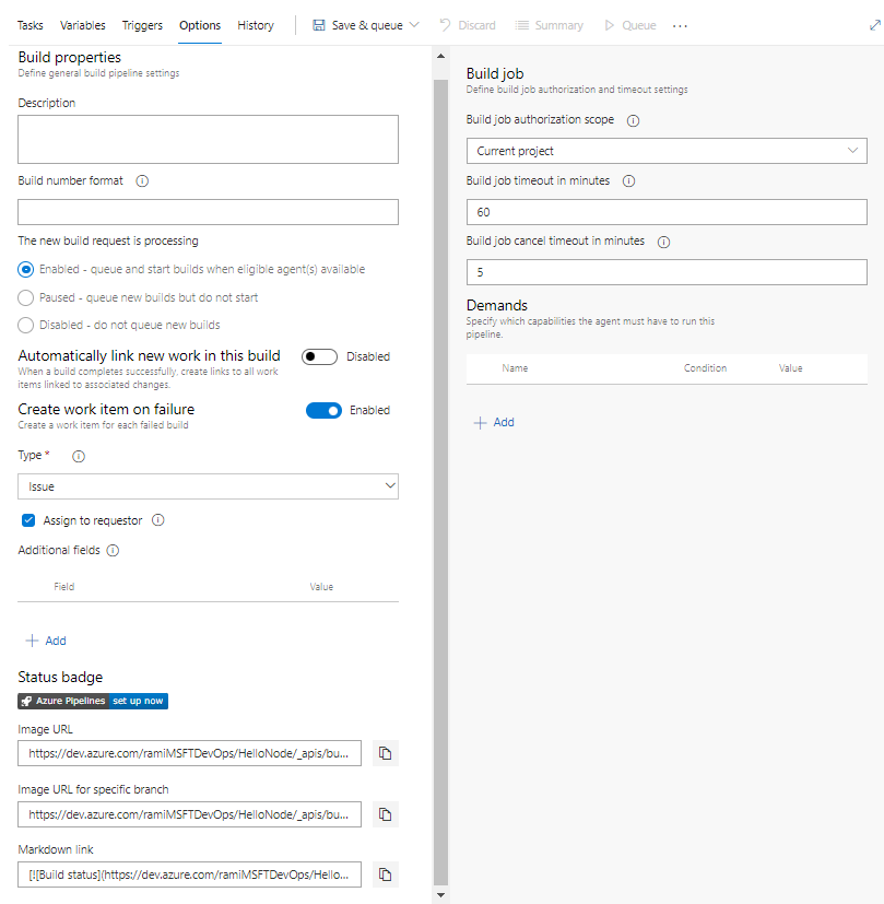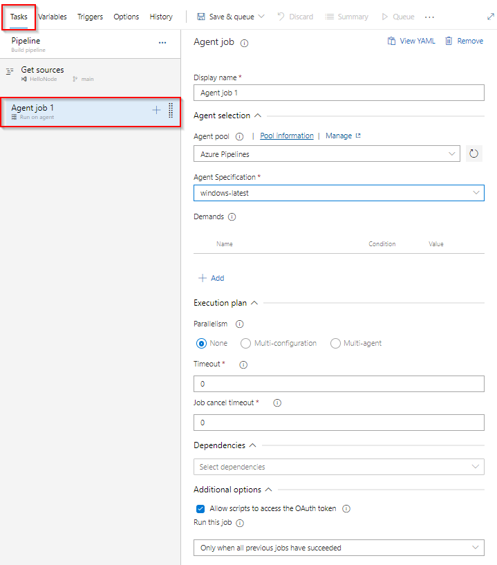 Klassiska pipelines gör det enklare för utvecklare att utforma sina pipelinearbetsflöden med hjälp av användargränssnittet för att lägga till uppgifter och villkor som är skräddarsydda för deras scenario. Den här artikeln beskriver de tillgängliga alternativen för att konfigurera agentjobbet och utforskar de olika byggegenskaperna för den klassiska pipelinen.