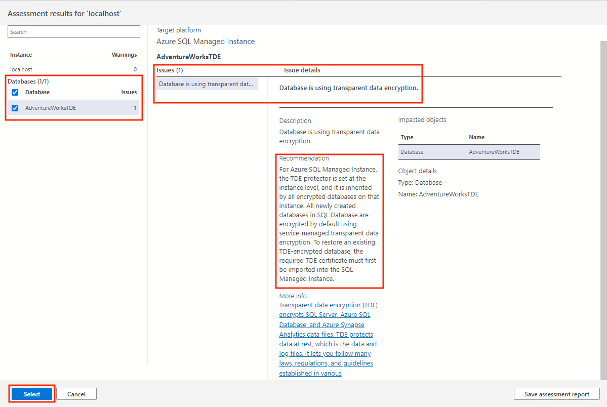 AdventureWorksTDEdatabasen är skyddad med transparent datakryptering (TDE). Utvärderingen rekommenderar att du migrerar TDE-certifikatet innan du migrerar källdatabasen till målet för den hanterade instansen.Välj Välj för att öppna konfigurationspanelen för TDE-migrering.