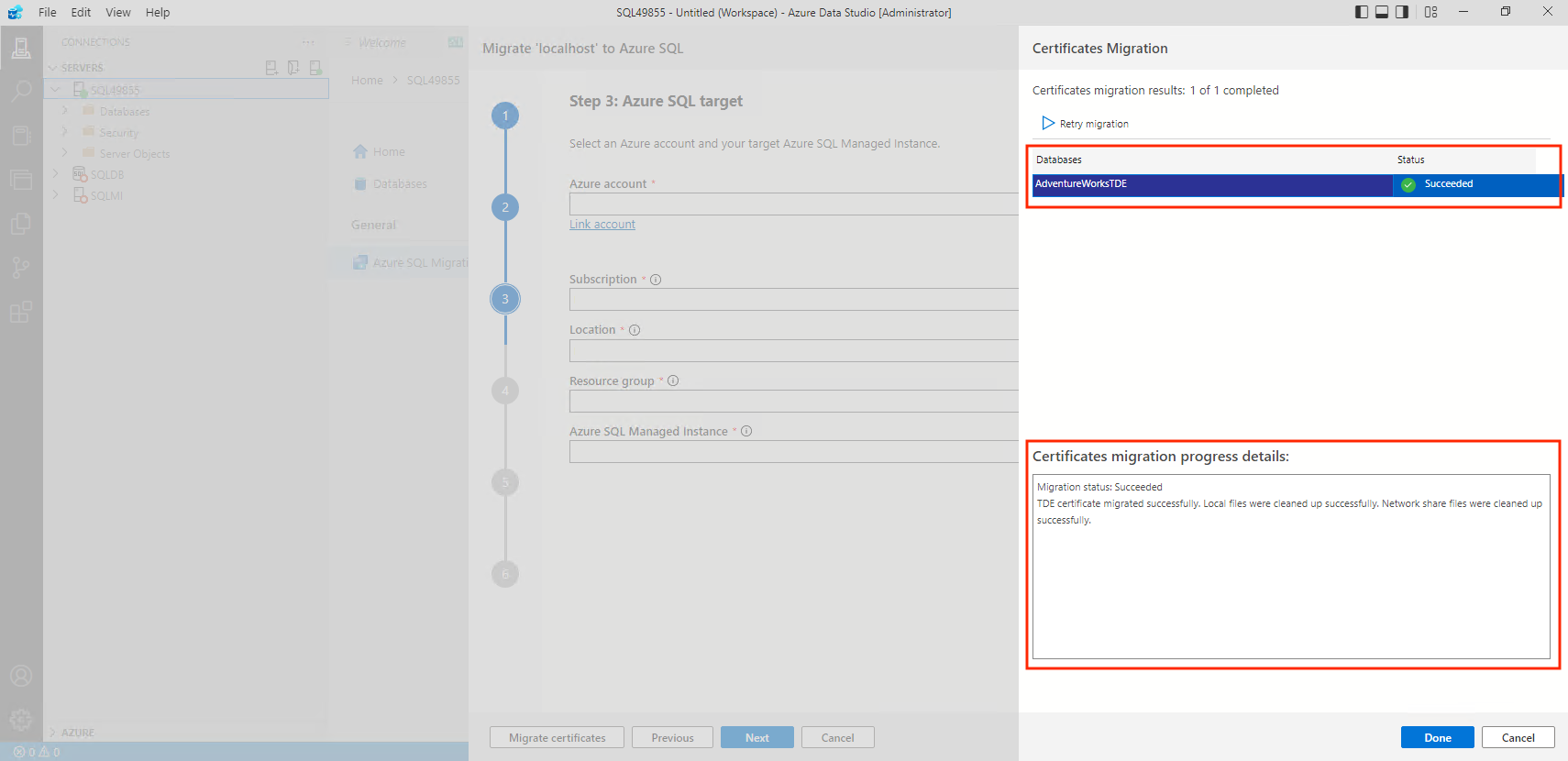 När du är klar väljer du Migrera certifikat för att starta migreringen av TDE-certifikat.
